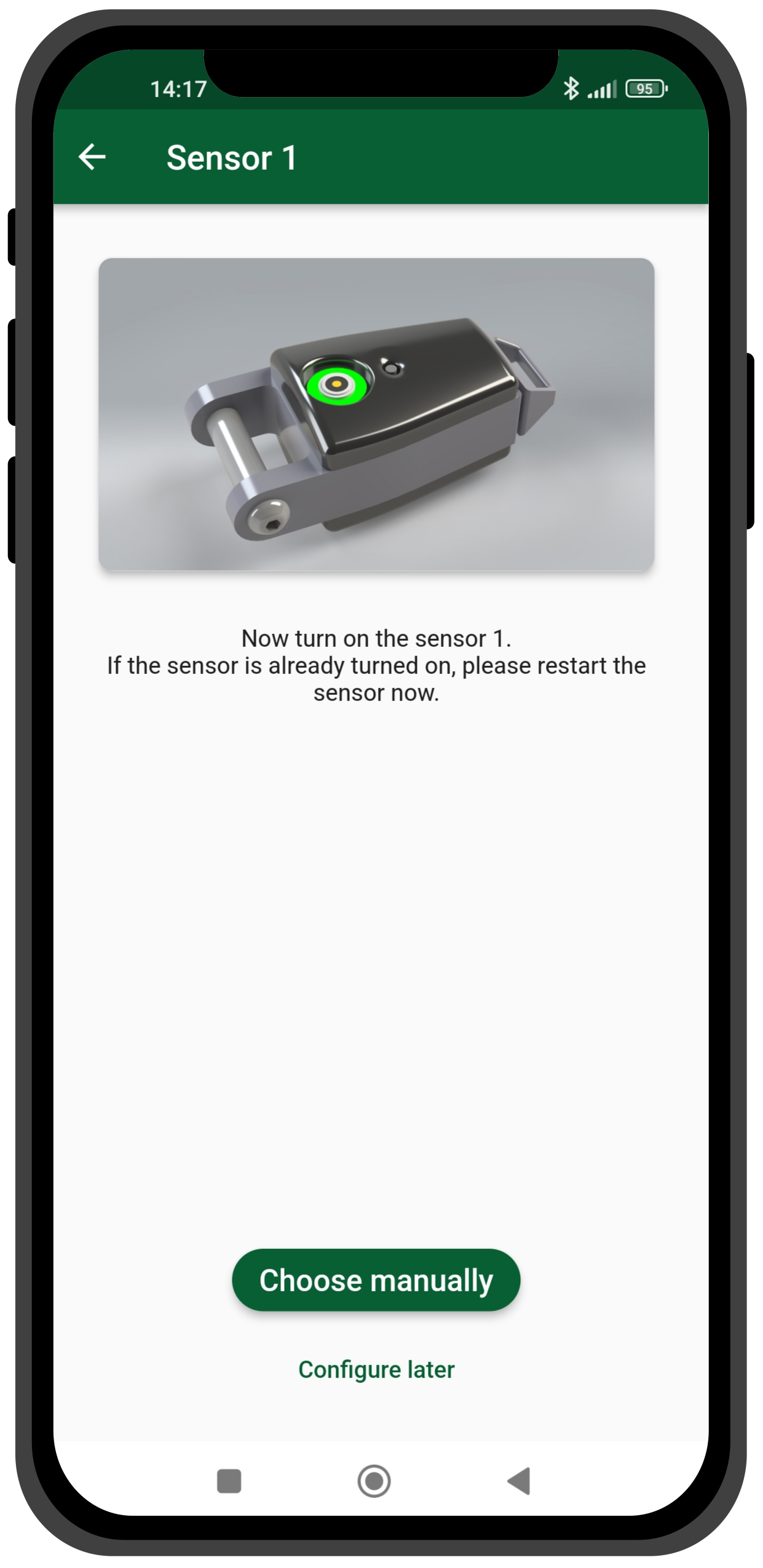 Now switch on the first sensor. This should automatically connect to the app. If this is not the case, try restarting the app or click on Choose manually. If manual selection is chosen, a list of available sensors will show.